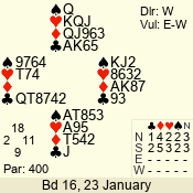 | Con | Dc | Res | Score | Ld | Pairs | Rd | Tbl | | 3 N | N | = | 400 | 2 | 01 - 04 | 4 | 1 |