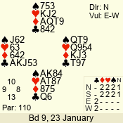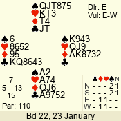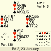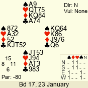 | Con | Dc | Res | Score | Ld | Pairs | Rd | Tbl | | 2 N | S | +2 | 180 | 9 | 04 - 04 | 1 | 4 |