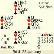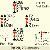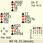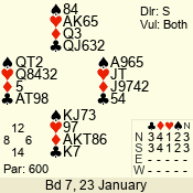 | Con | Dc | Res | Score | Ld | Pairs | Rd | Tbl | | 3 N | S | = | 600 | 2 | 04 - 01 | 4 | 4 |
