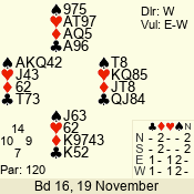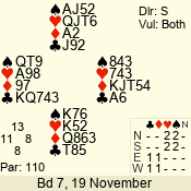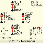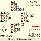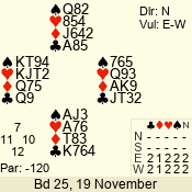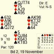 | Con | Dc | Res | Score | Ld | Pairs | Rd | Tbl | | 2 N | S | = | 120 | J | 04 - 02 | 3 | 4 |