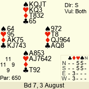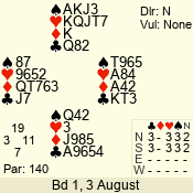 | Con | Dc | Res | Score | Ld | Pairs | Rd | Tbl | | 3 N | S | +1 | 630 | 4 | 03 - 07 | 4 | 3 |