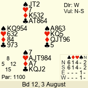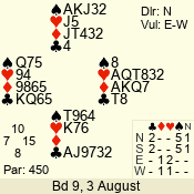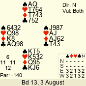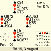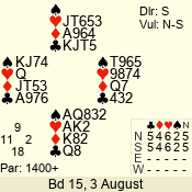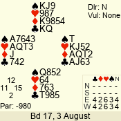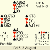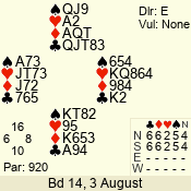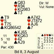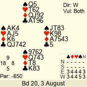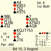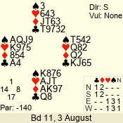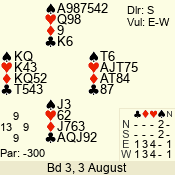 | Con | Dc | Res | Score | Ld | Pairs | Rd | Tbl | | 3 N | S | +3 | 690 | Q | 04 - 03 | 2 | 4 |