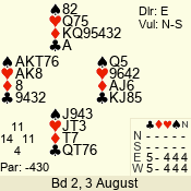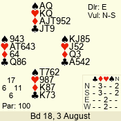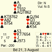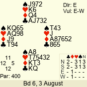 | Con | Dc | Res | Score | Ld | Pairs | Rd | Tbl | | 3 N | S | = | 400 | 6 | 03 - 05 | 6 | 3 |
