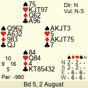| Con | Dc | Res | Score | Ld | Pairs | Rd | Tbl | | 3 N | S | = | 600 | 2 | 04 - 05 | 5 | 4 |