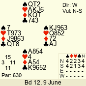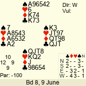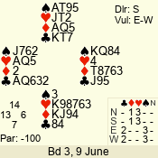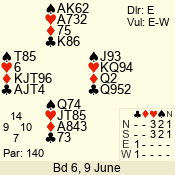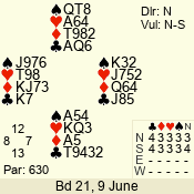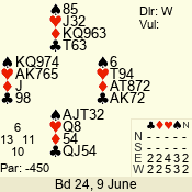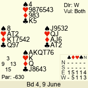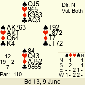 | Con | Dc | Res | Score | Ld | Pairs | Rd | Tbl | | 6 NT | W | -1 | 100 | 3 | 11 - 05 | 2 | 3 |
