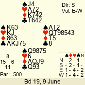 | Con | Dc | Res | Score | Ld | Pairs | Rd | Tbl | | 3 NT | N | = | 600 | 6 | 10 - 01 | 4 | 2 |