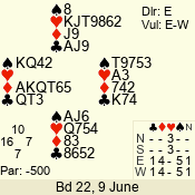 | Con | Dc | Res | Score | Ld | Pairs | Rd | Tbl | | 3 NT | N | +2 | 660 | 6 | 10 - 08 | 3 | 2 |