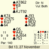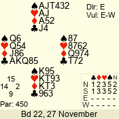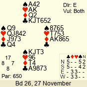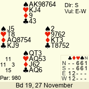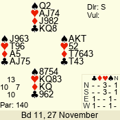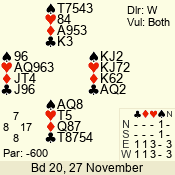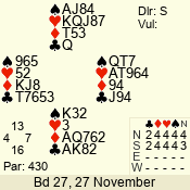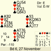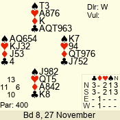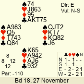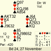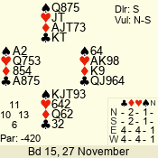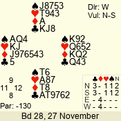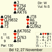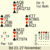 | Con | Dc | Res | Score | Ld | Pairs | Rd | Tbl | | 3 NT | N | +1 | 430 | A | 06 - 05 | 2 | 6 |