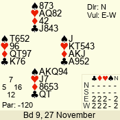 | Con | Dc | Res | Score | Ld | Pairs | Rd | Tbl | | 3 NT | W | -2 | 100 | 9 | 05 - 04 | 2 | 5 |