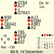 | 3 NT | W | +1 | -430 | 5 | 08 - 08 | 20 | 8 |