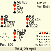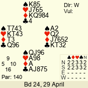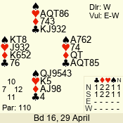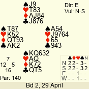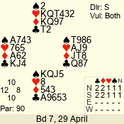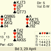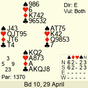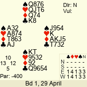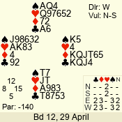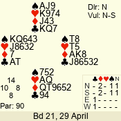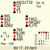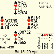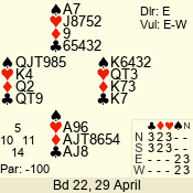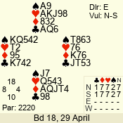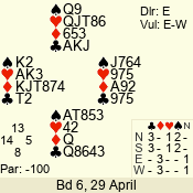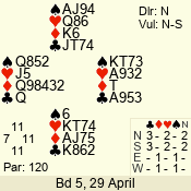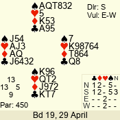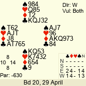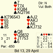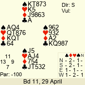 | Con | Dc | Res | Score | Ld | Pairs | Rd | Tbl | | 3 NT | N | +1 | 630 | 8 | 11 - 12 | 12 | 11 |