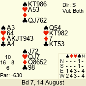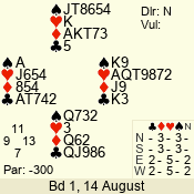 | Con | Dc | Res | Score | Ld | Pairs | Rd | Tbl | | 3 NT | N | +1 | 630 | 3 | 03 - 01 | 3 | 3 |