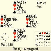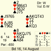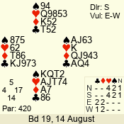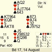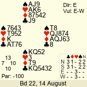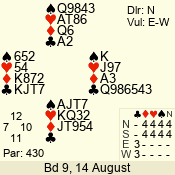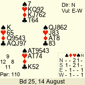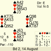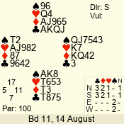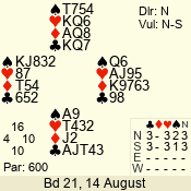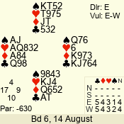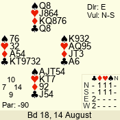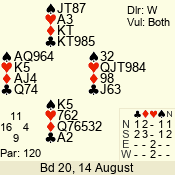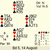 | Con | Dc | Res | Score | Ld | Pairs | Rd | Tbl | | 2 NT | N | = | 120 | 6 | 05 - 02 | 4 | 5 |