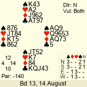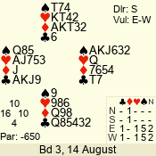 | Con | Dc | Res | Score | Ld | Pairs | Rd | Tbl | | 1 NT | S | +2 | 150 | A | 03 - 05 | 4 | 3 |