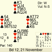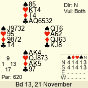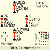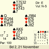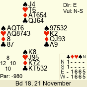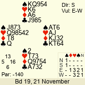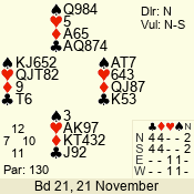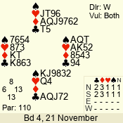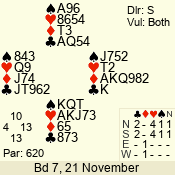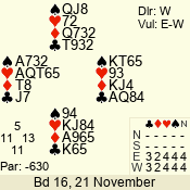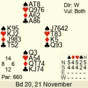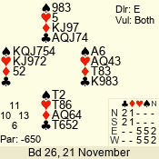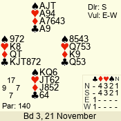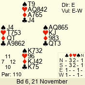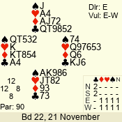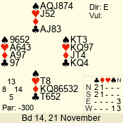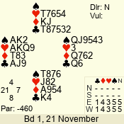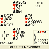| Con | Dc | Res | Score | Ld | Pairs | Rd | Tbl | | 2 NT | S | +2 | 180 | 8 | 11 - 11 | 1 | 11 |