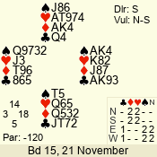 | Con | Dc | Res | Score | Ld | Pairs | Rd | Tbl | | 2 NT | N | = | 120 | 5 | 07 - 09 | 10 | 7 |