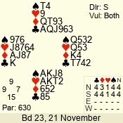 | Con | Dc | Res | Score | Ld | Pairs | Rd | Tbl | | 3 NT | N | +1 | 630 | 4 | 07 - 04 | 4 | 7 |