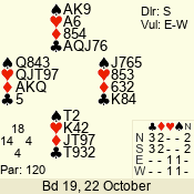 | Con | Dc | Res | Score | Ld | Pairs | Rd | Tbl | | 2 NT | S | = | 120 | 6 | 01 - 03 | 5 | 1 |