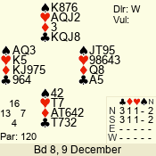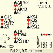 | Con | Dc | Res | Score | Ld | Pairs | Rd | Tbl | | 2 NT | S | = | 120 | 2 | 11 - 08 | 4 | 11 |