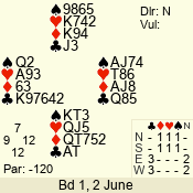 | Con | Dc | Res | Score | Ld | Pairs | Rd | Tbl | | 2 NT | N | = | 120 | Q | 02 - 02 | 1 | 2 |
