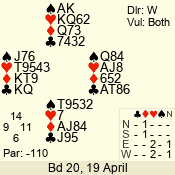 | Con | Dc | Res | Score | Ld | Pairs | Rd | Tbl | | 1 NT | W | -3 | 150 | K | 10 - 04 | 7 | 10 |