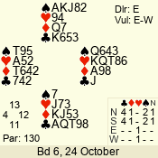 | Con | Dc | Res | Score | Ld | Pairs | Rd | Tbl | | 6 NT | E | -3 | 150 | K | 11 - 10 | 2 | 11 |