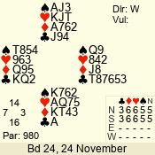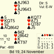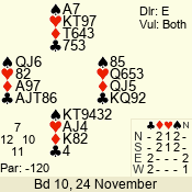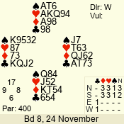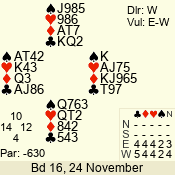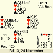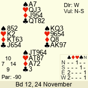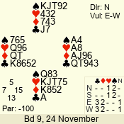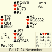 | 3 NT | S | +1 | 430 | Q | 17 - 12 | 1 | 2 |