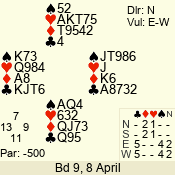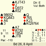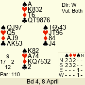 | Con | Dc | Res | Score | Ld | Pairs | Rd | Tbl | | 3 NT | W | -2 | 100 | 5 | 04 - 05 | 9 | 4 |