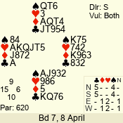 | Con | Dc | Res | Score | Ld | Pairs | Rd | Tbl | | 7 NT | N | = | 1520 | 5 | 08 - 08 | 1 | 8 |