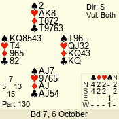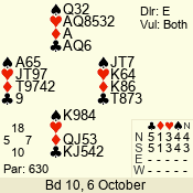 | Con | Dc | Res | Score | Ld | Pairs | Rd | Tbl | | 3 N | S | +1 | 630 | 3 | 07 - 02 | 6 | 7 |