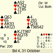 | Con | Dc | Res | Score | Ld | Pairs | Rd | Tbl | | 3 NT | W | -4 | 200 | 8 | 13 - 02 | 12 | 13 |
