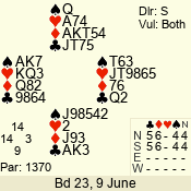 | Con | Dc | Res | Score | Ld | Pairs | Rd | Tbl | | 3 NT | N | +1 | 630 | J | 07 - 02 | 6 | 7 |