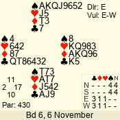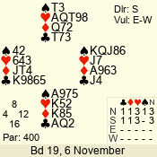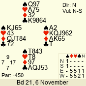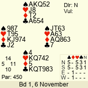 | Con | Dc | Res | Score | Ld | Pairs | Rd | Tbl | | 3 NT | S | +1 | 430 | 6 | 06 - 09 | 3 | 5 |