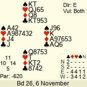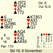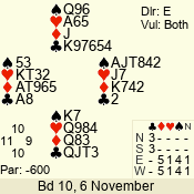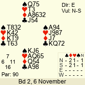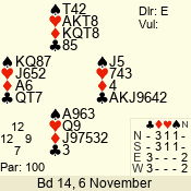 | Con | Dc | Res | Score | Ld | Pairs | Rd | Tbl | | 3 NT | E | -1 | 100 | 5 | 09 - 03 | 6 | 5 |