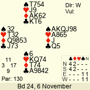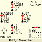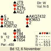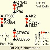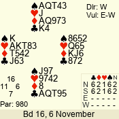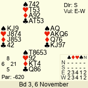 | Con | Dc | Res | Score | Ld | Pairs | Rd | Tbl | | 2 NT | S | = | 120 | 5 | 13 - 09 | 5 | 7 |