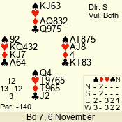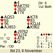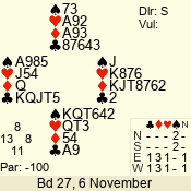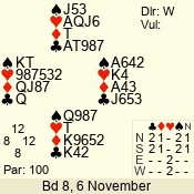 | Con | Dc | Res | Score | Ld | Pairs | Rd | Tbl | | 1 NT | S | +1 | 120 | T | 13 - 03 | 8 | 7 |