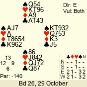 | Con | Dc | Res | Score | Ld | Pairs | Rd | Tbl | | 3 N | E | -1 | 50 | 4 | 02 - 03 | 9 | 2 |