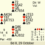 | Con | Dc | Res | Score | Ld | Pairs | Rd | Tbl | | 1 N | S | +1 | 120 | Q | 08 - 06 | 3 | 8 |