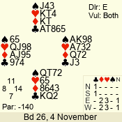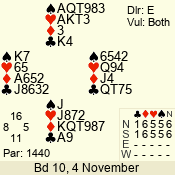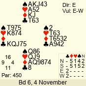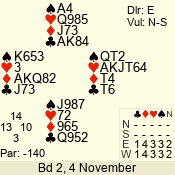 | Con | Dc | Res | Score | Ld | Pairs | Rd | Tbl | | 2 N x | E | -4 | 1100 | 9 | 08 - 12 | 6 | 5 |