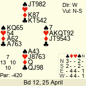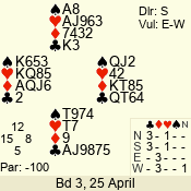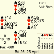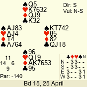 | Con | Dc | Res | Score | Ld | Pairs | Rd | Tbl | | 3 N | E | = | -600 | J | 06 - 11 | 12 | 2 |