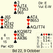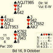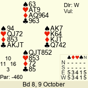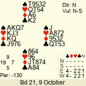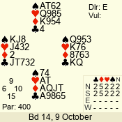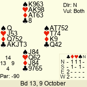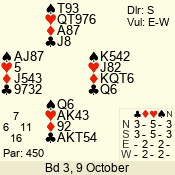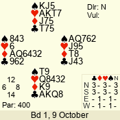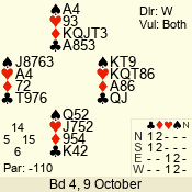| Con | Dc | Res | Score | Ld | Pairs | Rd | Tbl | | 3 N | E | -4 | 400 | 9 | 06 - 10 | 9 | 6 |