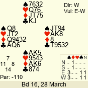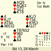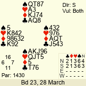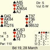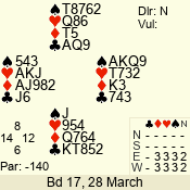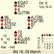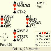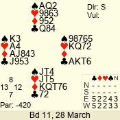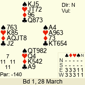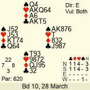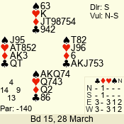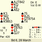 | Con | Dc | Res | Score | Ld | Pairs | Rd | Tbl | | 3 N | N | +1 | 630 | 6 | 06 - 02 | 5 | 6 |