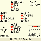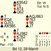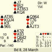 | Con | Dc | Res | Score | Ld | Pairs | Rd | Tbl | | 3 N | E | -2 | 200 | 4 | 02 - 05 | 10 | 2 |