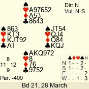| Con | Dc | Res | Score | Ld | Pairs | Rd | Tbl | | 3 N | S | = | 600 | 3 | 05 - 08 | 10 | 5 |