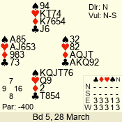 | Con | Dc | Res | Score | Ld | Pairs | Rd | Tbl | | 3 N | E | -4 | 400 | 3 | 05 - 06 | 12 | 5 |