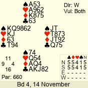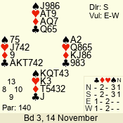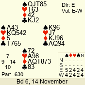 | Con | Dc | Res | Score | Ld | Pairs | Rd | Tbl | | 3 N | N | +1 | 630 | J | 11 - 09 | 3 | 11 |