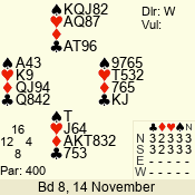 | Con | Dc | Res | Score | Ld | Pairs | Rd | Tbl | | 3 N | S | = | 400 | K | 12 - 01 | 12 | 12 |