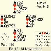 | Con | Dc | Res | Score | Ld | Pairs | Rd | Tbl | | 3 N | S | = | 400 | K | 12 - 01 | 12 | 12 |