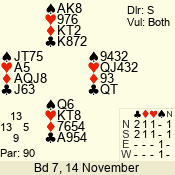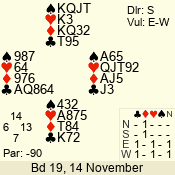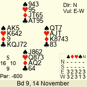 | Con | Dc | Res | Score | Ld | Pairs | Rd | Tbl | | 3 N | N | +1 | 630 | J | 11 - 09 | 3 | 11 |