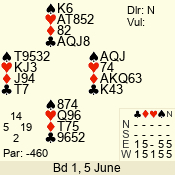 | Con | Dc | Res | Score | Ld | Pairs | Rd | Tbl | | 3 N | N | +1 | 430 | 4 | 01 - 07 | 3 | 1 |